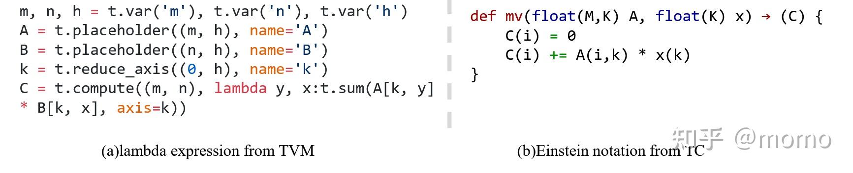 • 爱因斯坦记号:爱因斯坦记号(也称为求和约定)被TC采用。爱因斯坦记号是表达求和的一种记号。以矩阵向量乘法的定义(如图3(b)所示)[89]为例,不需要定义索引的临时变量。TC IR可以通过未定义变量的出现来推断实际表达式。例如,在图3(b)的第二行中,变量k只存在于右侧,因此运算符+将在k表示的维度上执行归约运算符。在爱因斯坦记号表达式中,运算符需要是结合的和可交换的,像max这样的运算符不被支持。这个限制保证了归约运算符可以按任何顺序执行,使进一步的并行化成为可能。